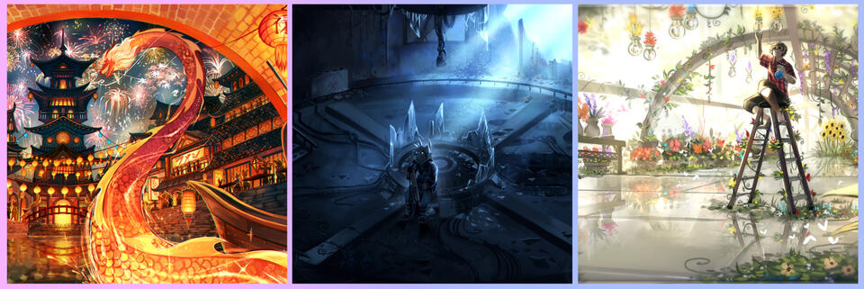 (A painting with mainly focus on surrounding of one’s world building and not the characters)