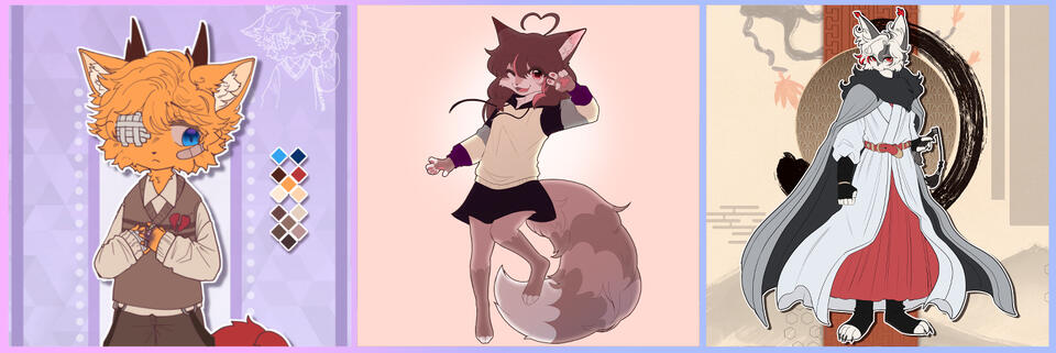 What includes: 2 flat colored fullbody + 1 extra fullbody or 2 headshots + 1 color pallette sheet + 1 graphic designed backgroundExtra pawpads/mouths/eyes/ect... +$7 per parts